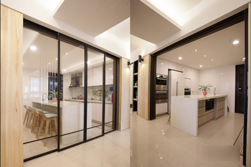 未来有生小孩打算的新人,建议作稍大一点的中岛吧台,而开放式厨房以黑色铝框拉门崁上清波区隔空间,能阻隔油烟也保留视觉宽敞度。